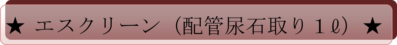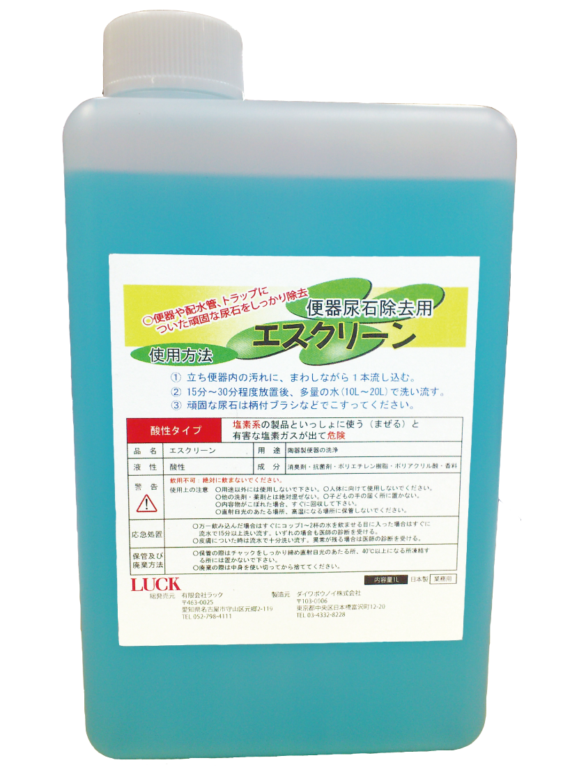【エスクリーン 尿石取り】 トイレを清掃しても臭う。水の流れが悪い。 それは便器(トラップ)や配管に尿石がこびり付いて悪臭を放っていることが多いです。 特に男子便器は水がフタ代わりになっておらず、配管からの臭いが上がってきます。 エスクリーンは配管や便器についている尿石を除去します。 一般清掃業者が使っている物は劇薬を使用している為、免許が無いと使用できません。 エスクリーンは、劇薬を使用しなく、最大の効果を発揮する商品です。 また、配管を傷めない安全設計。 清掃業者を呼ばなくても、従業員やアルバイトの方でも使用でき、コストパフォーマンスに優れています。 再付着を防ぐ効果もあるので、1度の使用で半年間効果が継続します。(使用頻度により異なります) |