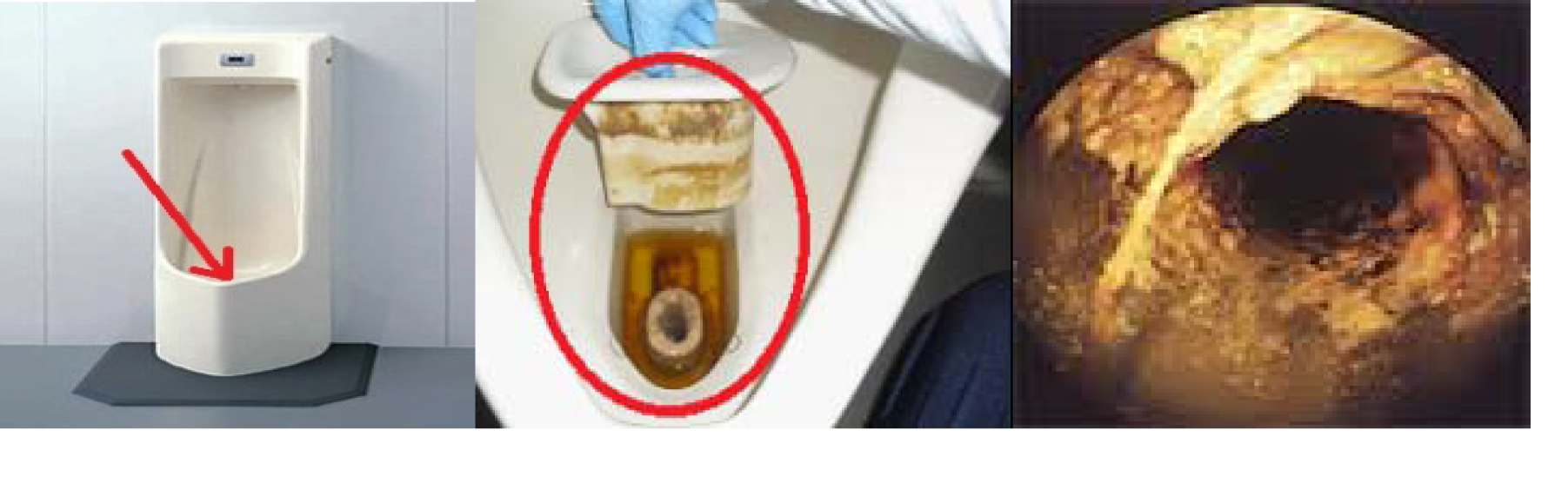 ※綺麗に見える男子便器 ※トラップは凄い尿石 ※配管も尿石で流れが悪い |